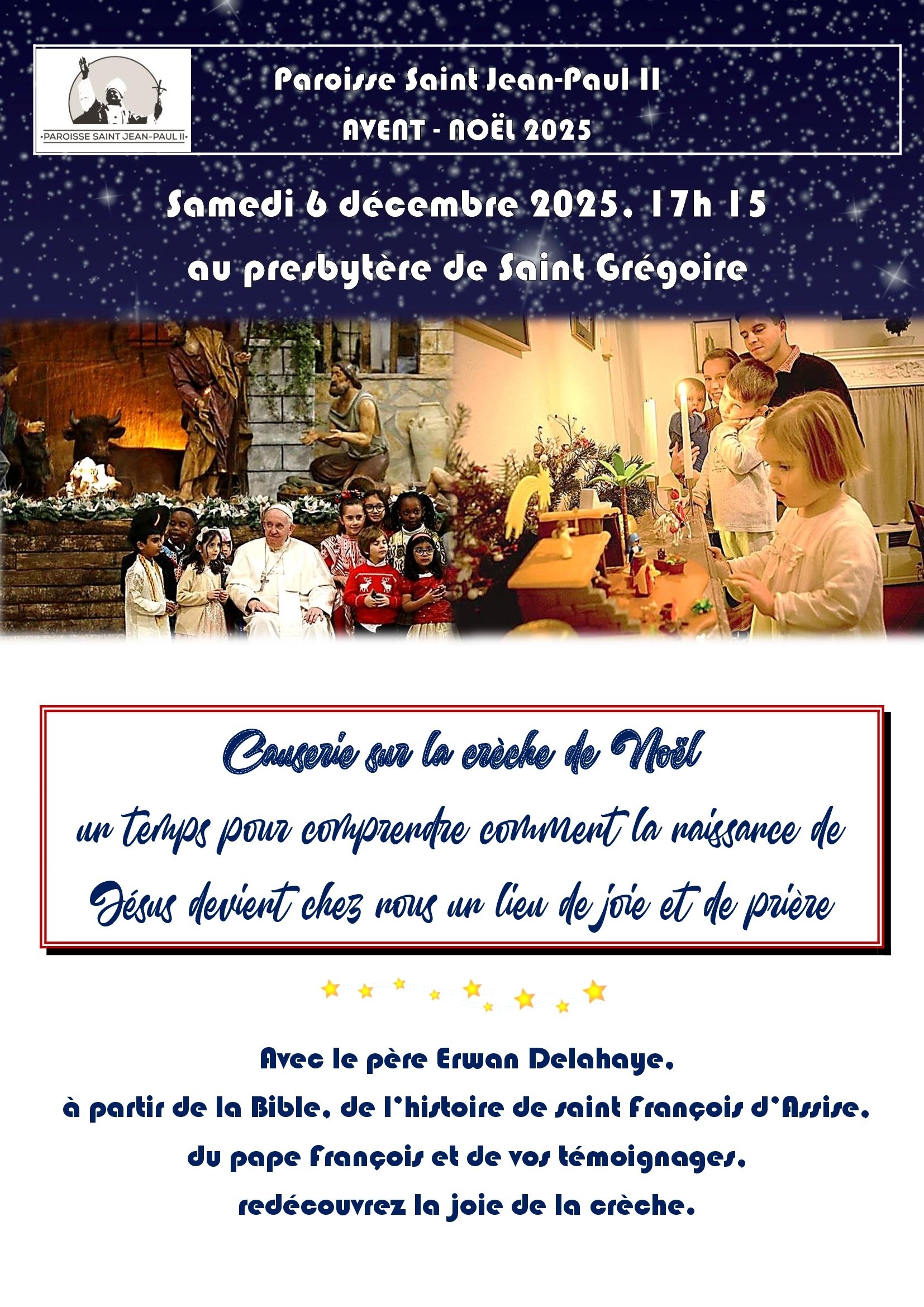 👉 De 17h15 à 18h00, le Père Erwan t’invite, avec ta famille, à une causerie spéciale Noël au presbytère de Saint-Grégoire.