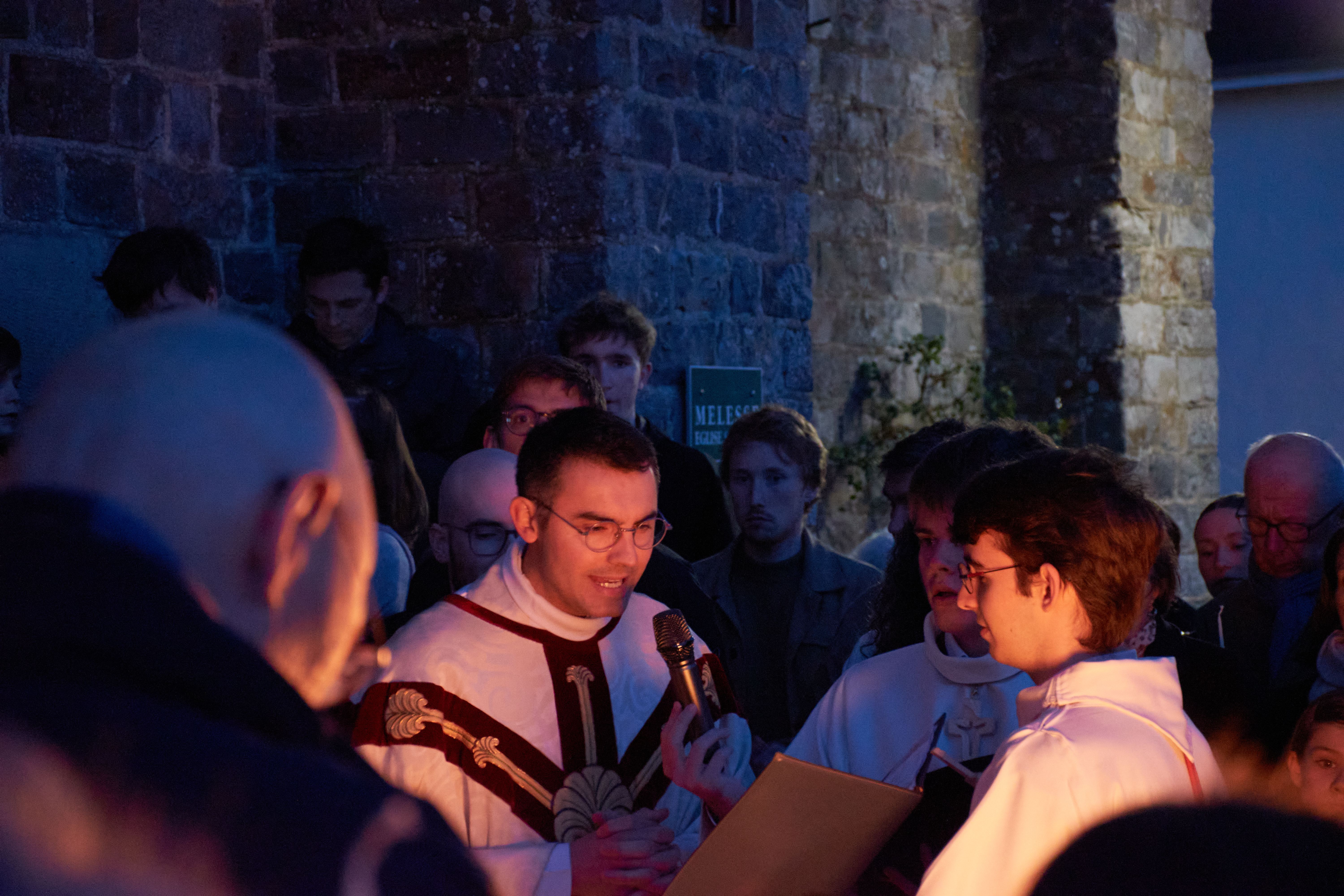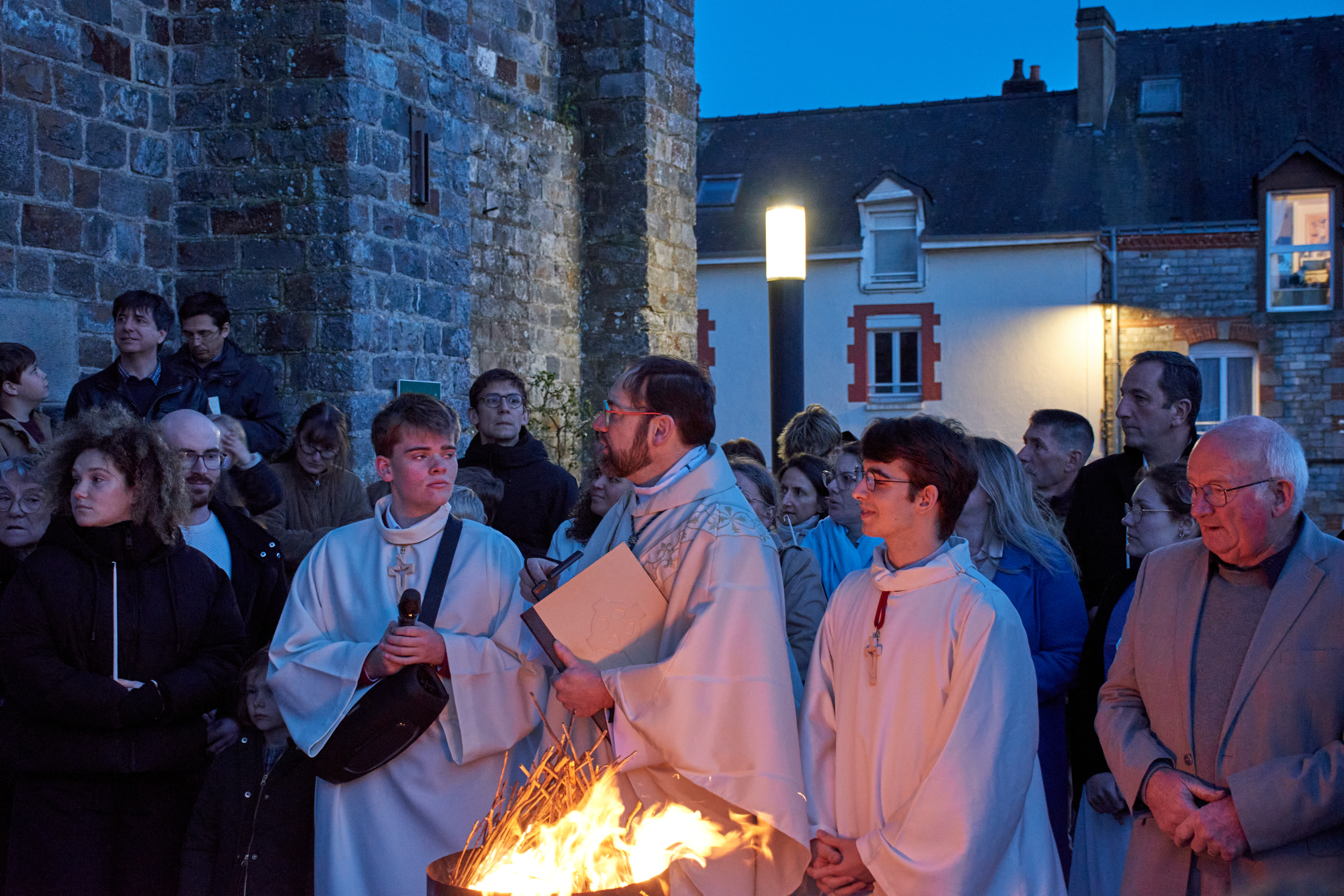Les paroissiens se rassemblent dehors autour d’un feu. Chacun tient en main un cierge encore éteint. Le prêtre bénit le feu nouveau, symbole puissant d’une vie qui jaillit au cœur de la nuit. C’est de ce feu que sera allumé le cierge pascal, signe du Christ ressuscité.