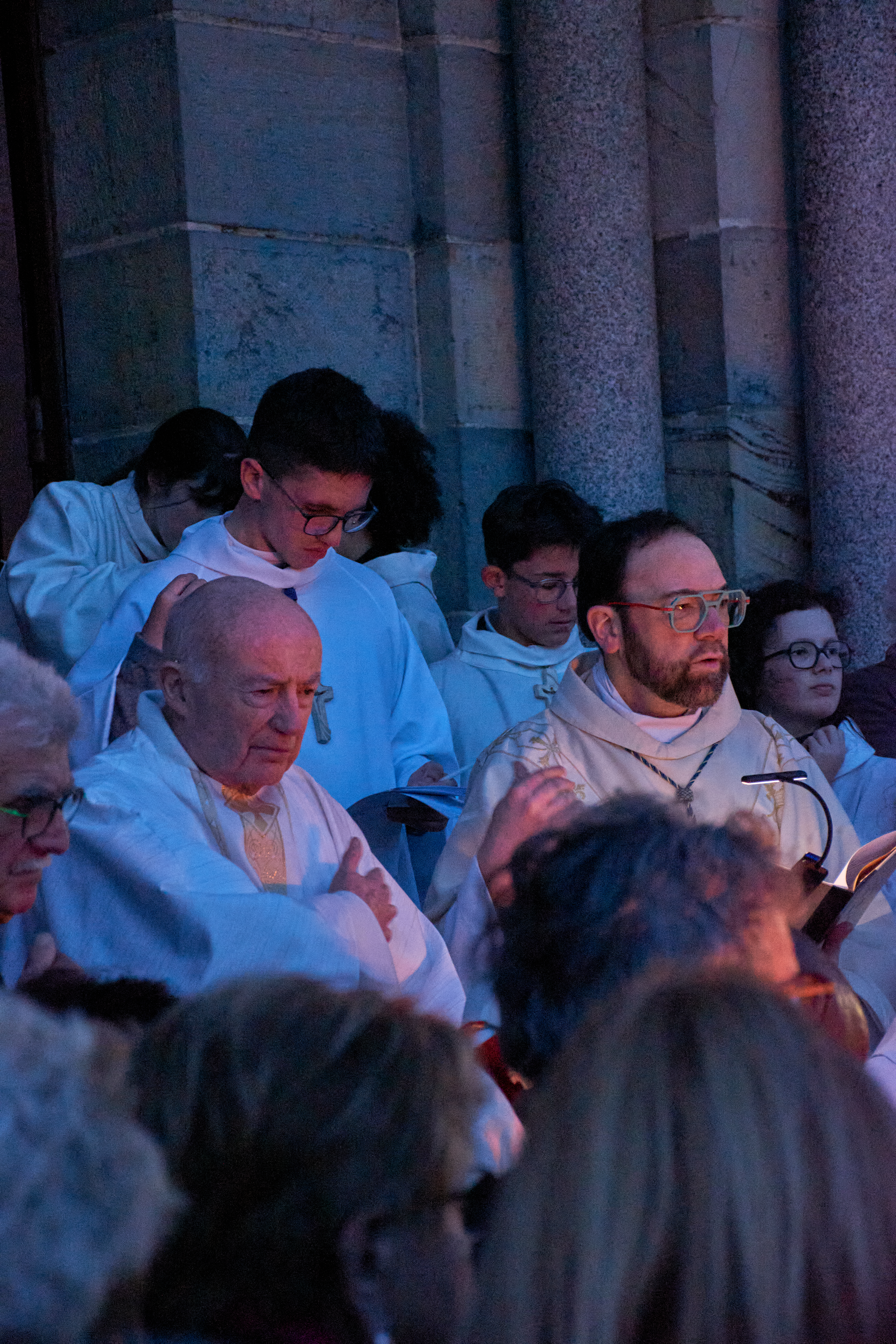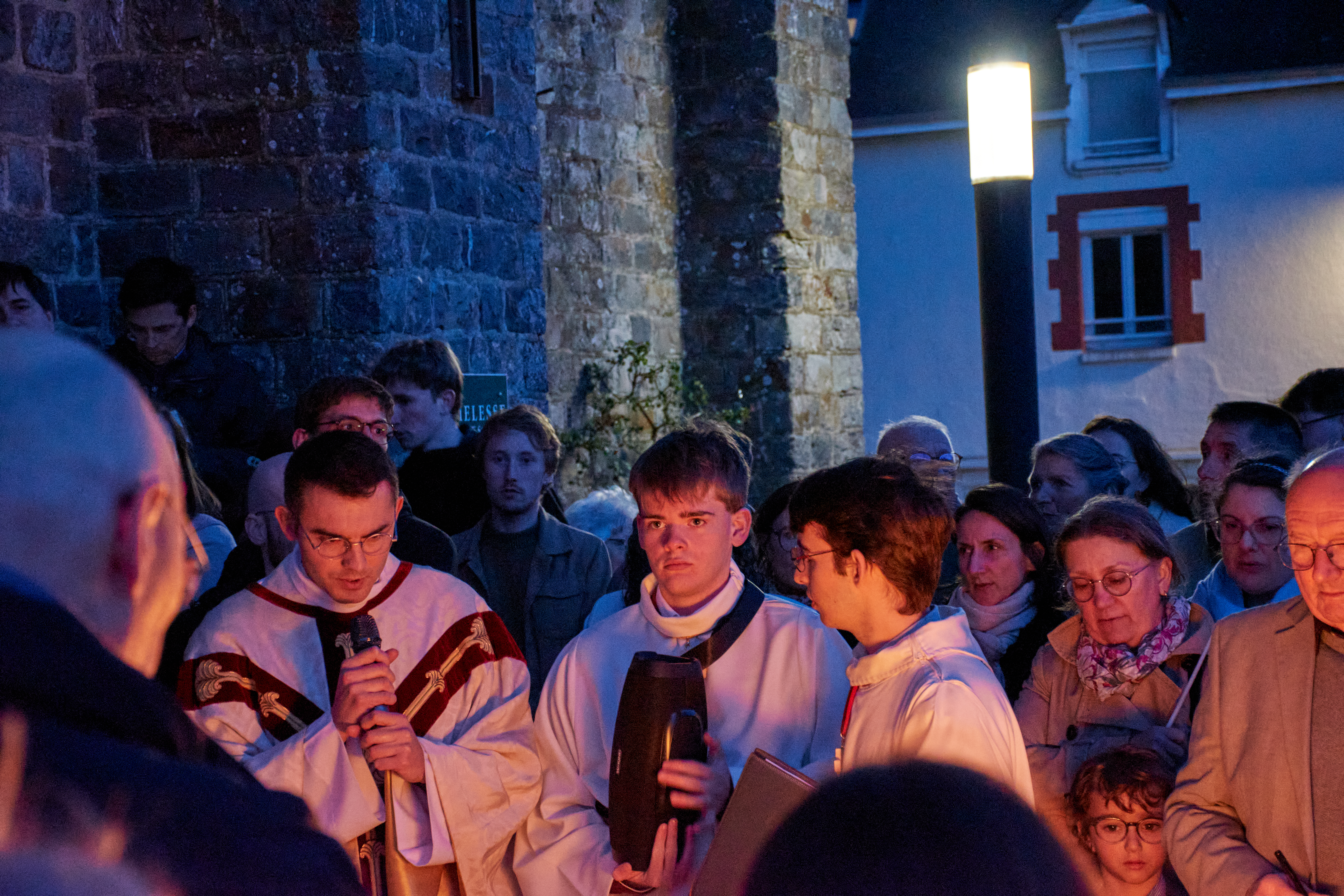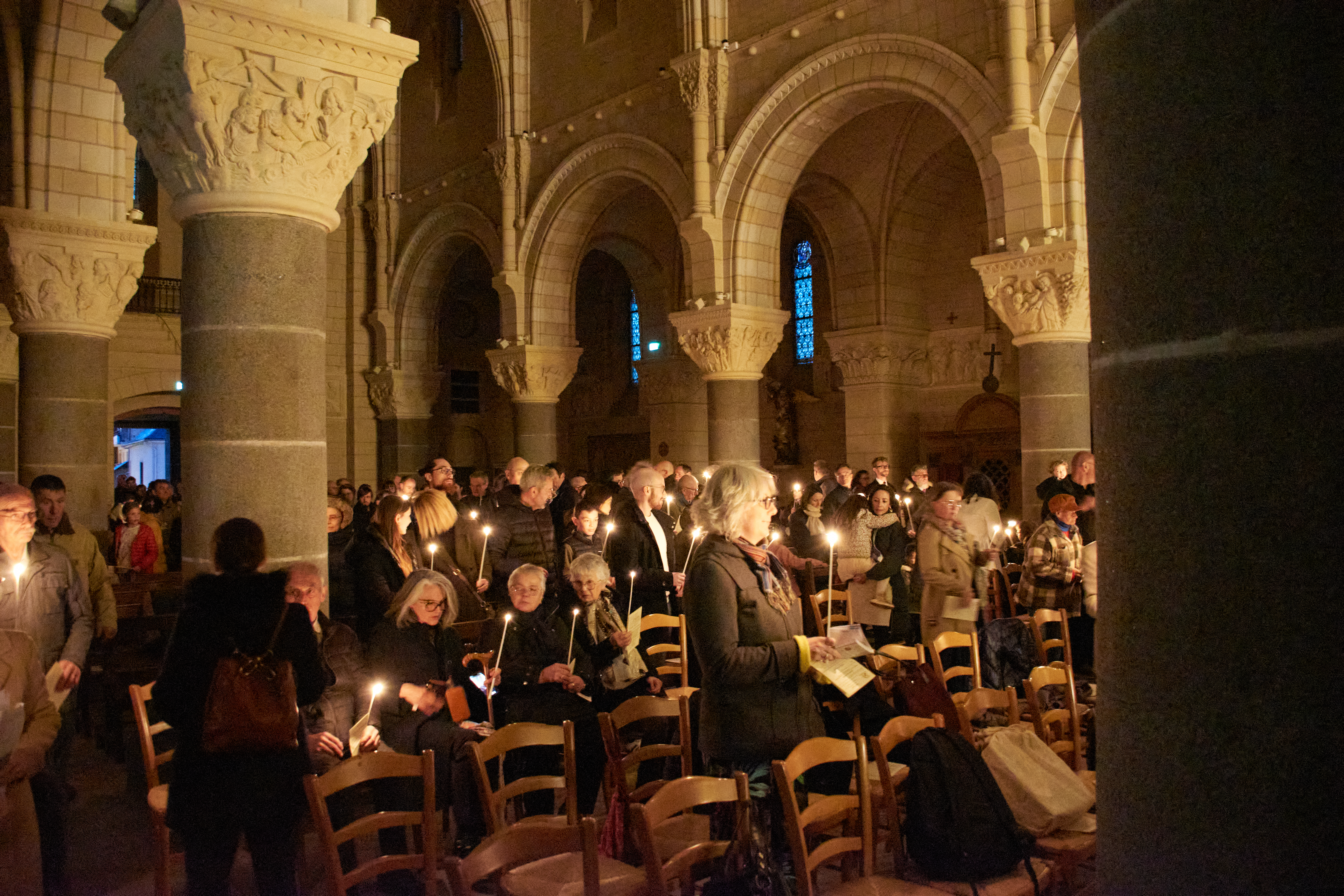 Tous entrent dans l’église encore plongée dans l’obscurité. Puis, progressivement, la lumière grandit. Les cierges brillent, les regards s’éclairent. Enfin, toutes les lumières de l’église s’allument : la nuit est vaincue.