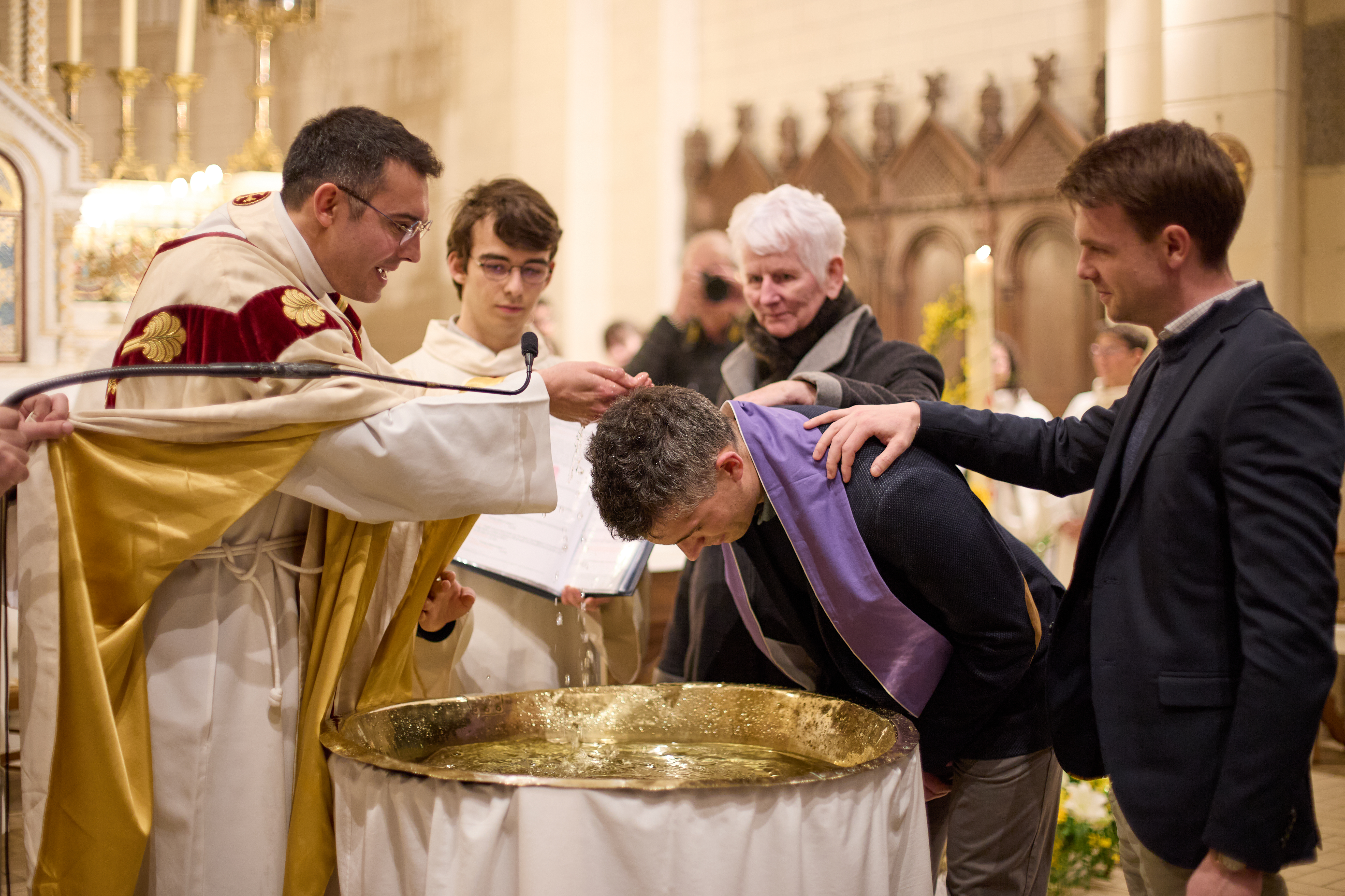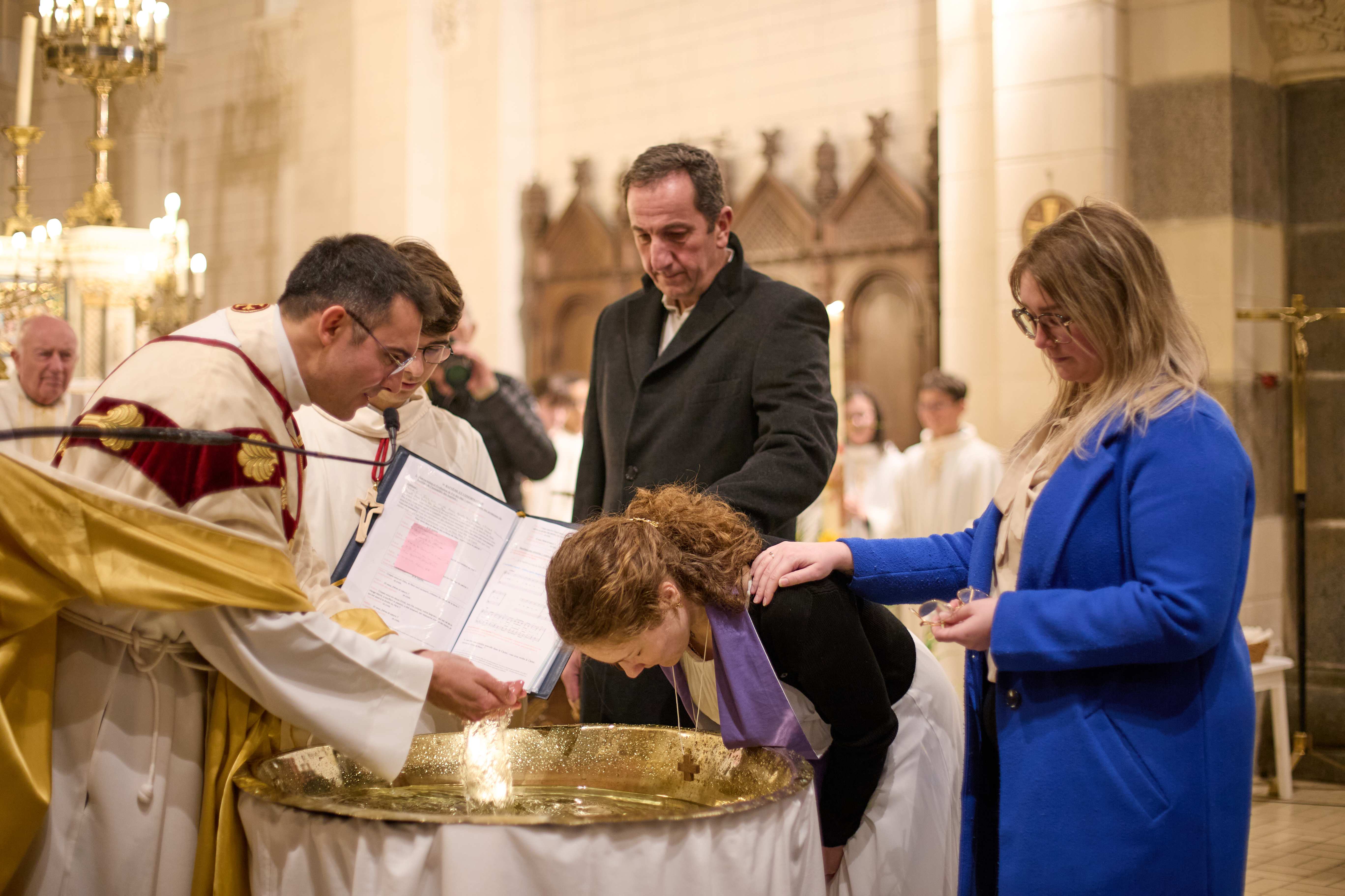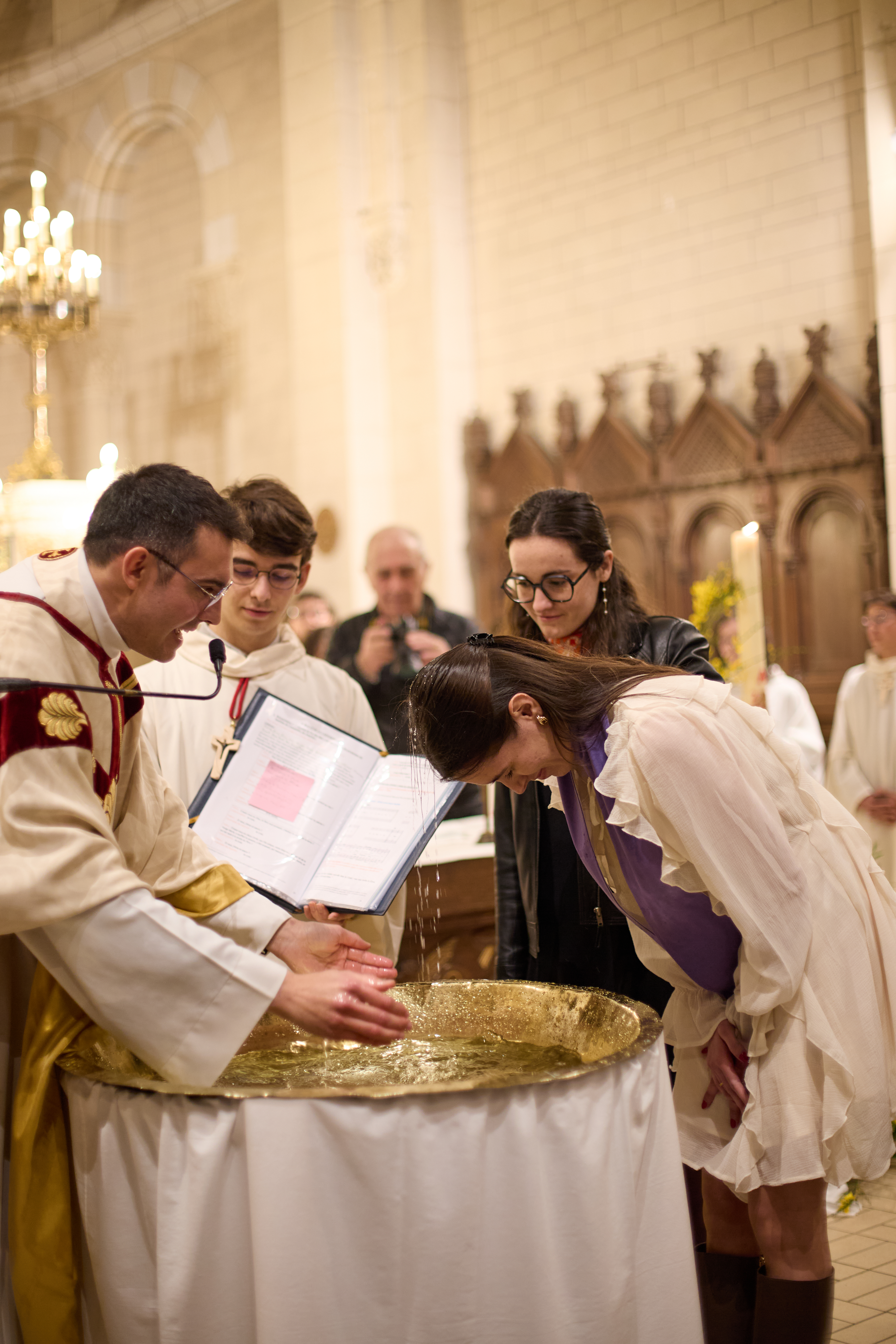 L’Évangile est proclamé. Puis vient un moment particulièrement émouvant : les futurs baptisés sont appelés à s’approcher de la fontaine baptismale. L’eau est bénite. Elle devient source de vie nouvelle. Les catéchumènes renoncent au mal, professent leur foi, et reçoivent le baptême. Chacun renaît dans la lumière du Christ.